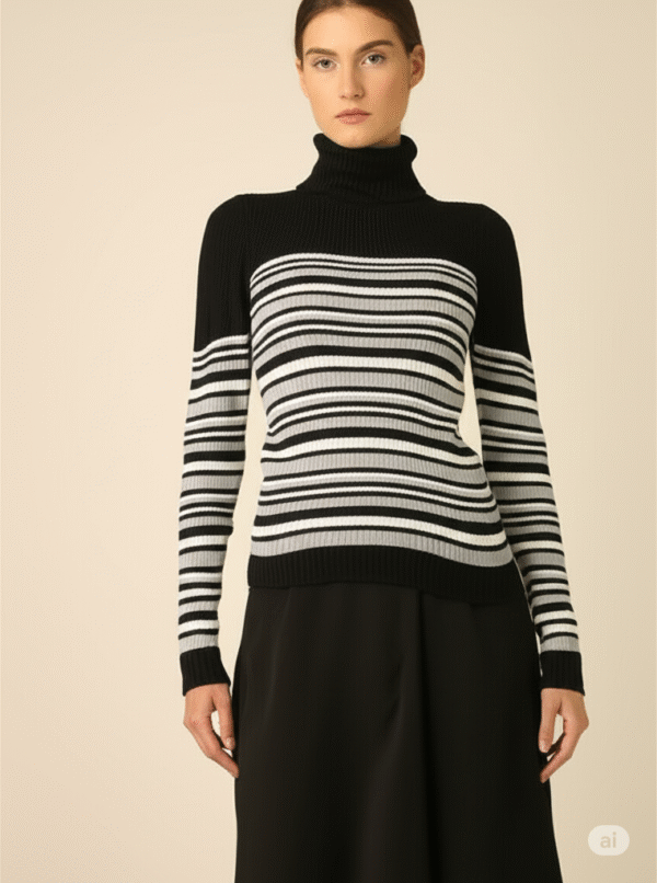 Blusa Cacharel Gola Alta Listrada Feminina – Preto, Cinza e Off‑White