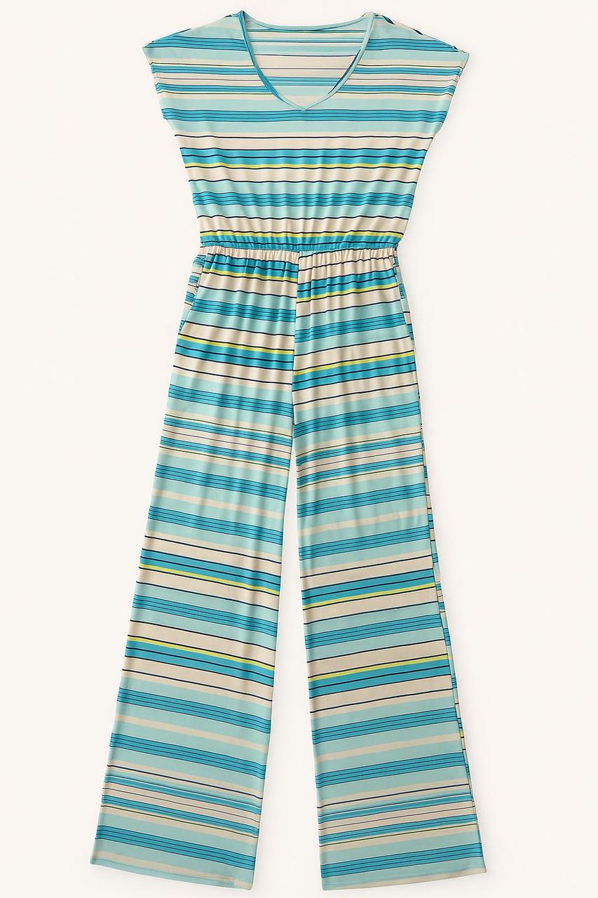 Macacão listrado de modelagem confortável e moderna. Peça única que dispensa combinações. Ideal para o dia a dia.