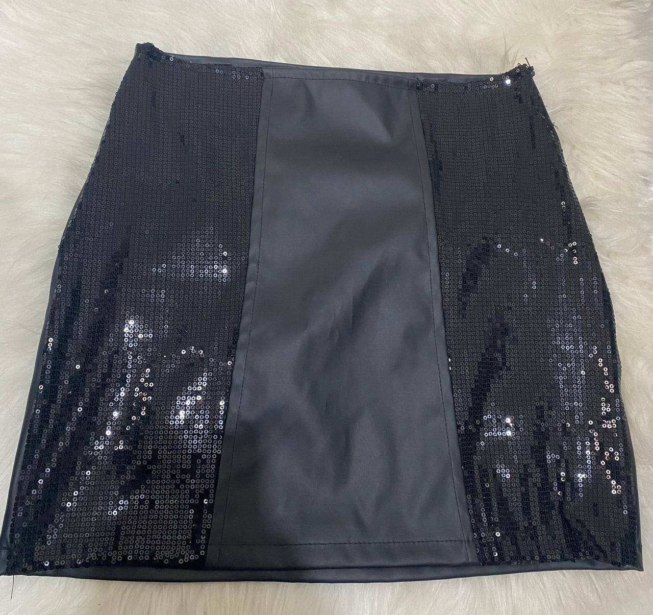 Saia feminina tamanho M em couro sintético com aplicação de paetês que criam um visual glamouroso e sofisticado. Perfeita para baladas festas e ocasiões especiais onde você quer brilhar. Design moderno que combina o charme do couro com o brilho dos paetês.